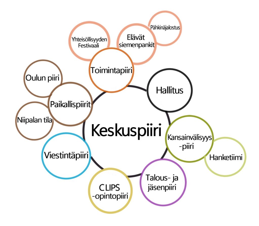 Yhdistys on järjestäytynyt sosiokratian mukaisesti piireihin, joista kukin vastaa omasta toiminta-alueestaan. Piireillä on selkeä rooli, oma vastuualue sekä mahdollisimman pitkälle viety autonomia päätöksenteossa ja toiminnan suunnittelussa. Tämä mahdollistaa joustavan, osallistavan ja jaetun johtamisen, jossa jokainen piiri voi kehittää omaa toimintaansa yhteisten arvojen ja tavoitteiden puitteissa. Piirit tekevät yhteistyötä keskenään ja ovat linkittyneet toisiinsa keskuspiirin kautta, joka tukee kokonaisuuden koordinaatiota ja viestintää.